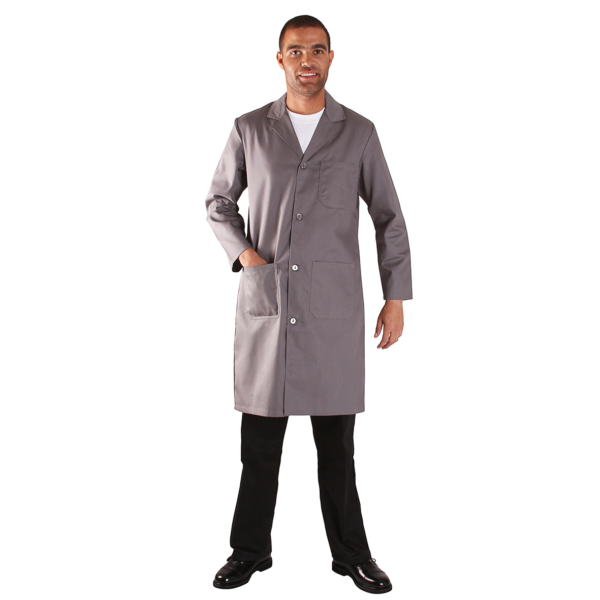 2 Front lower pockets, 1 Chest pocket, Knee length, Button front.